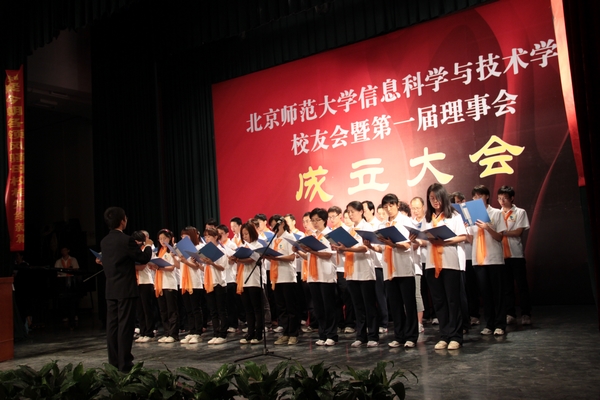 会上,戴汝为院士、韩震副校长、何克抗教授、周明全院长和郭军丽老师共同按下水晶球宣布信息科学与技术学院校友会成立。在师生合唱《起航--京师信科之歌》和《友谊地久天长》的优美旋律中,校友会成立大会圆满结束。