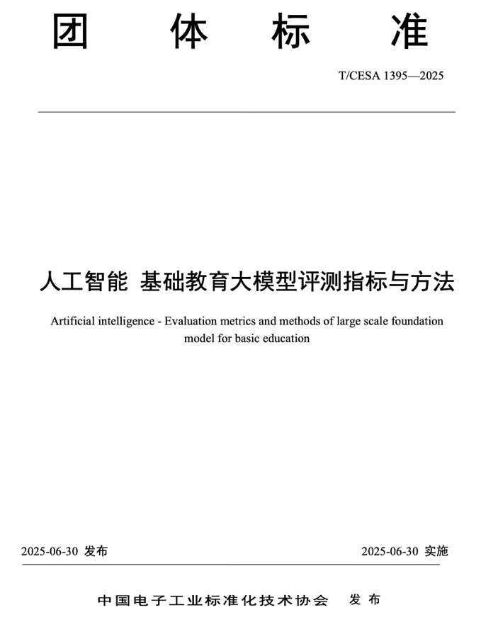 新葡的京集团35222牵头编制的T/CESA 1395-2025《人工智能 基础教育大模型评测指标与方法》团体标准,于2025年6月30日正式批准发布。