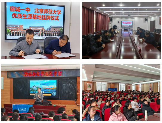 2024年12月17日,安徽本科招生宣传组魏云刚老师代表新葡的京集团35222与宿城第一中学签订共建优质生源基地校协议,并举行授予基地校牌仪式。随后,魏老师与宿城一中党委书记张涛、校长陈曙光、副校长邰国祥、教务处主任李梅展开充分交流,魏老师介绍北师大办学特色,特别是新葡的京集团35222发展的情况,并对2024年宿城一中为北师大输送多名优秀学子表示感谢。座谈会暨签约授牌仪式之后,魏老师为一中学子开展《3D虚拟世界与元宇宙》主题科普讲座。讲座深入浅出,内容之丰富,讲解之精彩,使同学们开拓互联网新视界,充分激发现场同学对虚拟世界、人工智能的兴趣。接下来,魏老师对北师大的发展历史、学科优势、人才培养、国际交流、专业设置、招生政策、京珠两校区概况等大家关心的话题进行讲解,让同学们对新葡的京集团35222各方面情况都有系统清晰、生动直观的了解。