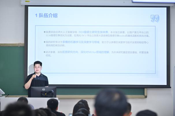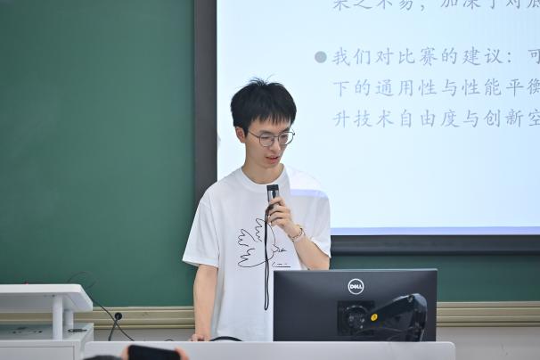 颁奖仪式后,进入优秀成果路演环节。一等奖团队代表颜方志同学首先登台,详细展示了其团队作品的创新点与技术实现路径,并与现场观众就大模型推理系统优化策略等问题展开深入交流。随后,二等奖团队代表张林焘同学重点介绍了面向曙光计算平台的优化方法。